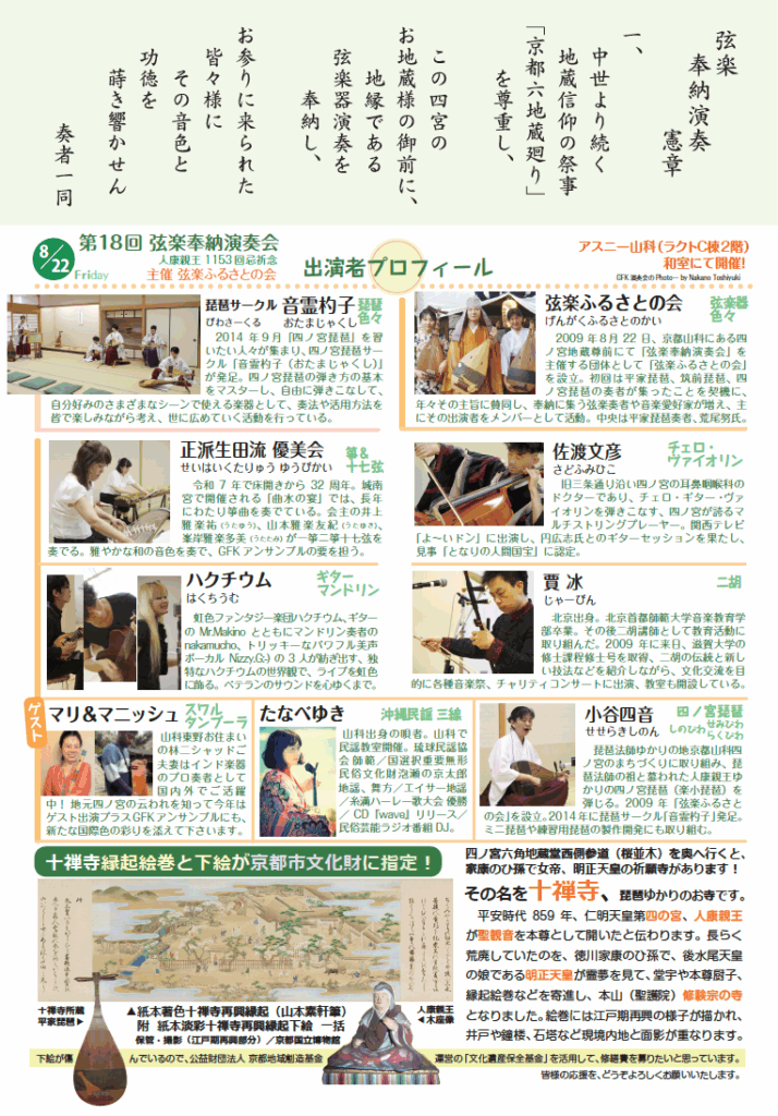 午前10時~琵琶、タンプーラ、三線、午後13時~にてギター&マンドリン、筝&十七弦、チェロ&バイオリン、二胡。午後三時からは、それらすべての楽器で弦楽アンサンブルを奏で四宮のお地蔵さんと観音さんに奉納いたします。
