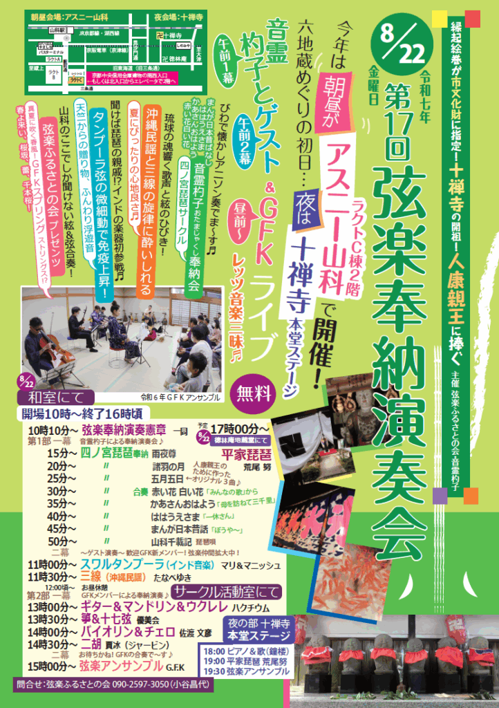 令和7年は8月22日(金)にアスニー山科和室にて開催します! 朝10時から夕方16時頃まで、和洋さまざまな弦楽の調べをお楽しみいただけます。無料なうえに申し込み不要、出入り自由、平日ですが、四宮祭りの散策を兼ねて「絃の音涼み」にぜひお出かけください。